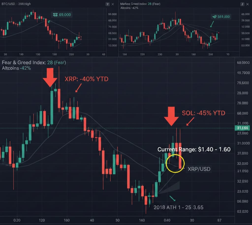 Los mercados de criptomonedas se mueven en ciclos, períodos de rápido crecimiento seguidos de correcciones profundas. A principios de 2026, el sentimiento se siente bajista: Bitcoin se encuentra cerca de $69K después de retroceder desde los máximos de 2025, mientras que altcoins importantes como Solana (SOL) y $XRP han bajado aproximadamente un 40–45% en lo que va del año. Históricamente, sin embargo, estas fases pesimistas a menudo preparan el escenario para la próxima gran subida.