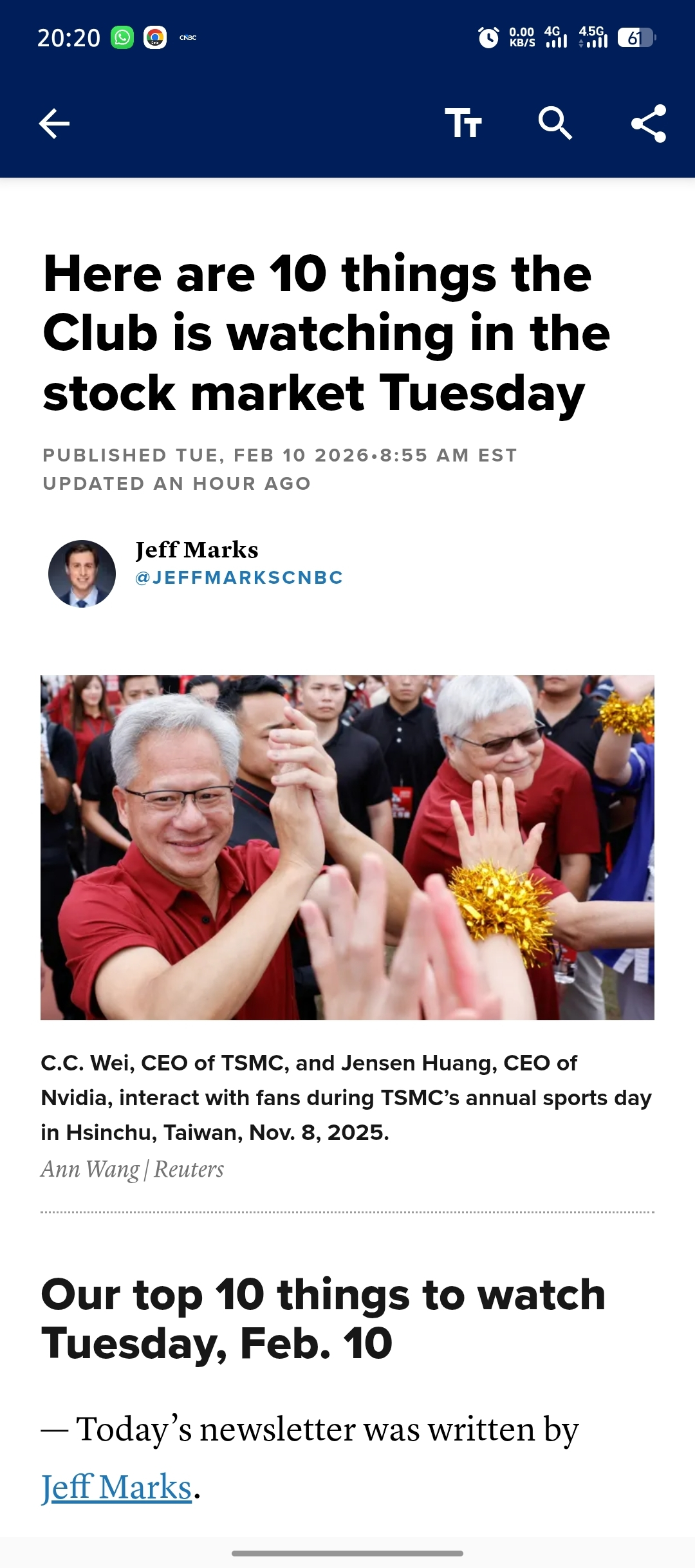 1. The S&P 500 was headed for a muted open this morning. We’re keeping an eye on chip stocks like Club names Nvidia and Broadcom after Taiwan Semi reported earnings. January sales increased 37% year over year for the company. It’s a good sign of artificial intelligence demand.