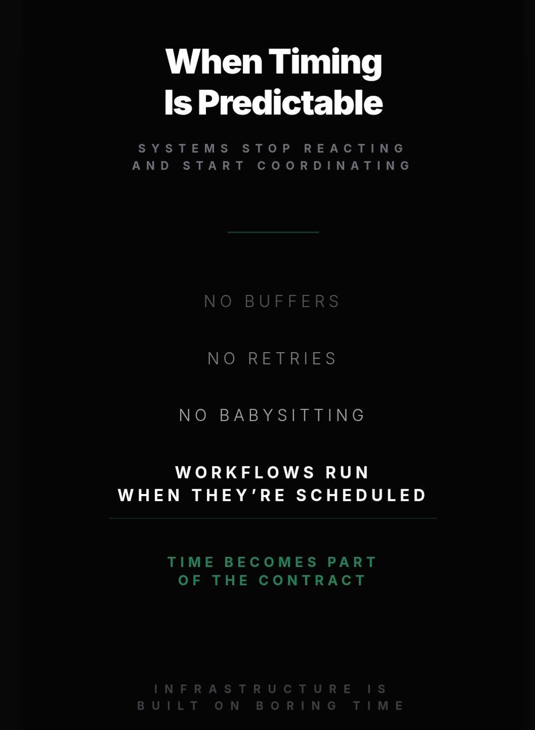 When you can rely on when things happen, you can start composing behavior instead of just triggering actions. You can build flows that assume rhythm instead of chaos. You can reason about dependencies in time, not just in code.