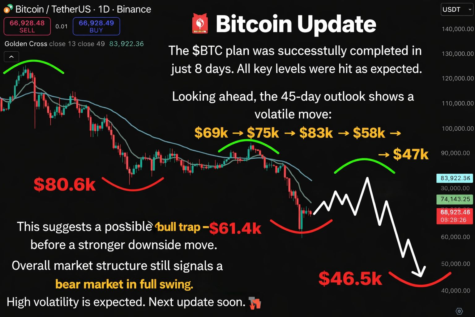 Looking ahead, the 45-day outlook shows a volatile move: $69k → $75k → $83k → $58k → $47k