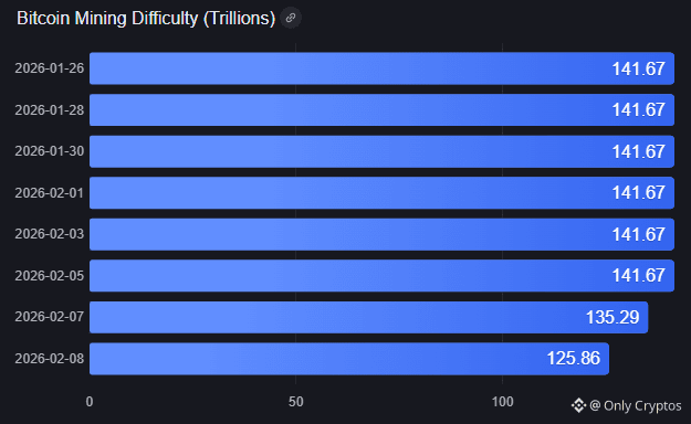 difficulty dropped sharply by 11.16%, falling to 125.86 trillion. This marks the largest negative adjustment since the 2021 China mining ban.