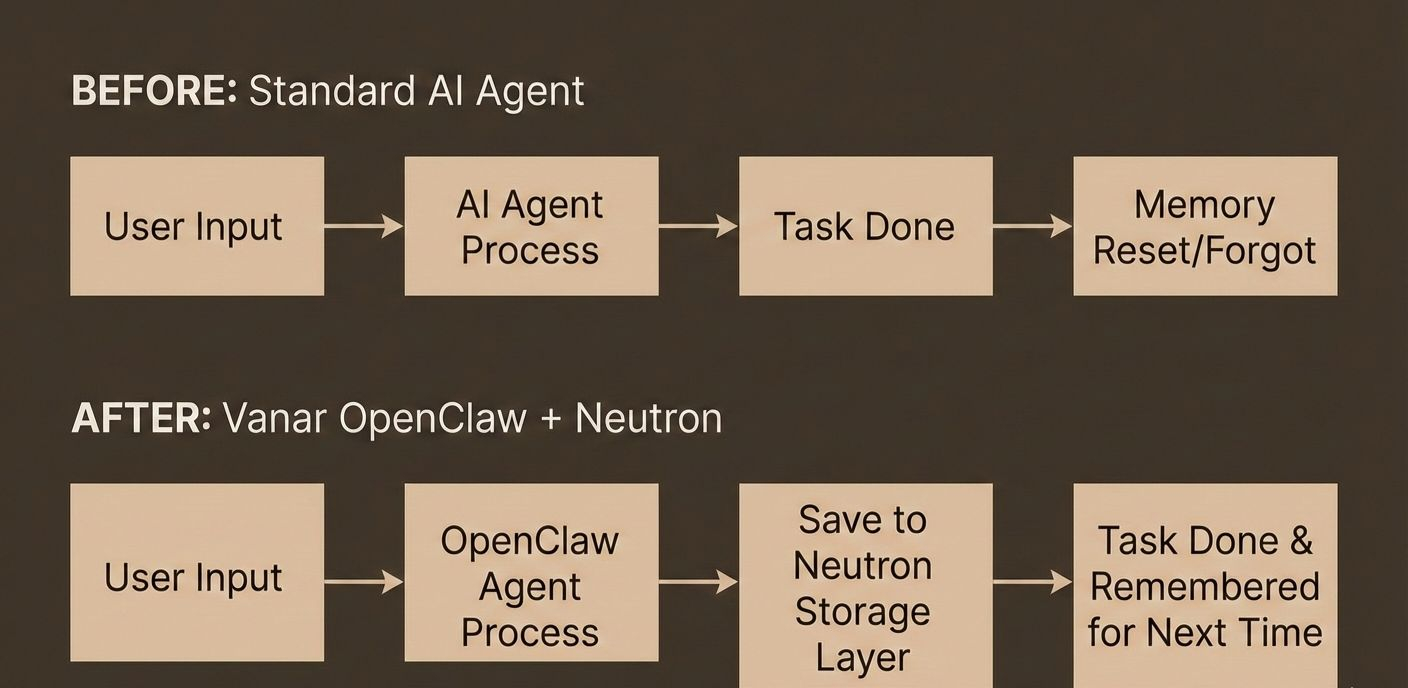 This new connection works a bit like the lasting memory in the human brain. Now, when an OpenClaw agent helps a user, it carefully stores relevant information in the Neutron layer. Then, when the user comes back, even after some time has passed, the agent can easily remember their preferences, so there's no need to repeat everything. This upgrade is a huge step forward, giving developers on Vanar the chance to build really smart applications that get better and more personalized over time, moving beyond simple task repetition