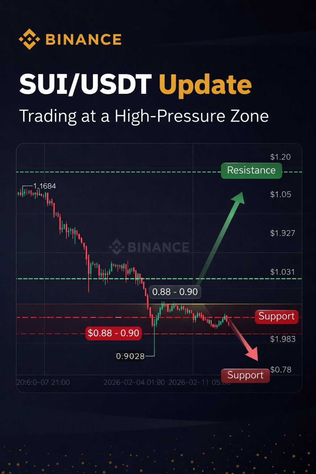 $SUI En la parte baja, la incapacidad de mantener el soporte de $0.88–$0.90 puede desencadenar una presión de venta renovada hacia $0.82, y potencialmente una nueva prueba de la demanda principal de $0.78. El volumen sigue siendo moderado, lo que significa que una ruptura fuerte o un colapso podrían expandir la volatilidad rápidamente. Los comerciantes deben estar atentos a una confirmación de cierre de vela de 4H antes de entrar en posiciones. Esta es una zona de alta reacción: el dinero inteligente se moverá primero.