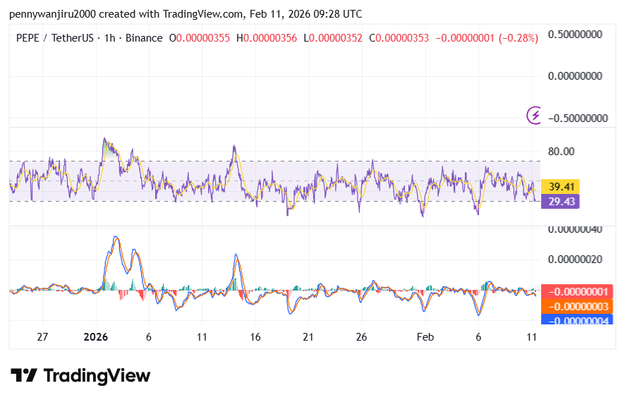El gráfico de Binance de 1 hora indica que los osciladores de momentum están por debajo de los niveles neutrales. El RSI está cerca de 40.30 y un oscilador secundario está cerca de 39.41. Estas lecturas colocan el momentum más cerca de un examen inferior que del lugar de sobrecompra, indicando un momentum neutral.
