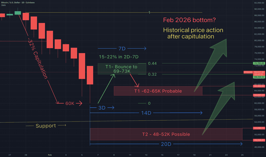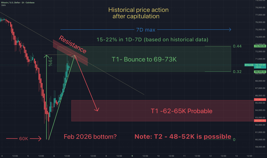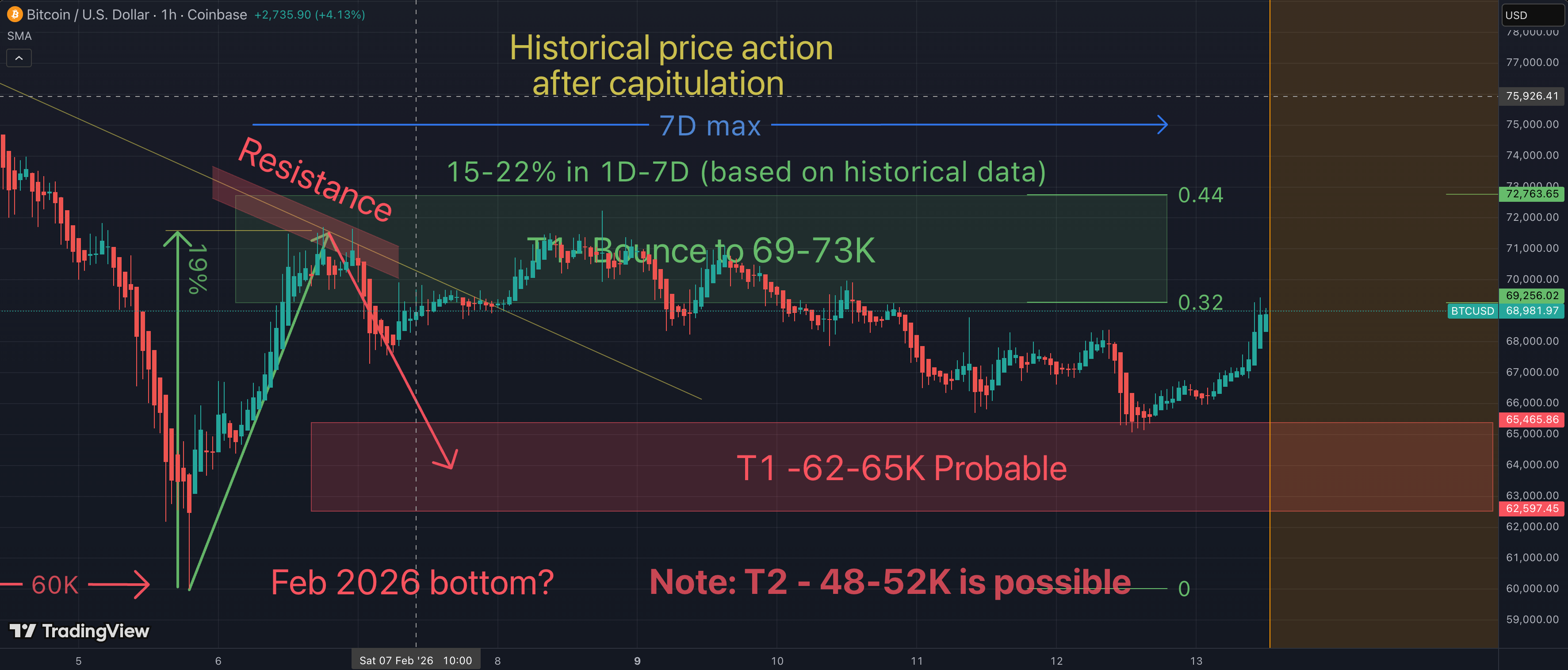 El 6 de febrero, describí las estructuras y objetivos típicos de formación de fondo basados en mis estudios de la acción del precio histórica y análisis estadístico. Esto me llevó a esperar un rebote de $60K a $71K (+/-1K)... y luego una mínima retroceso a $62-$65K