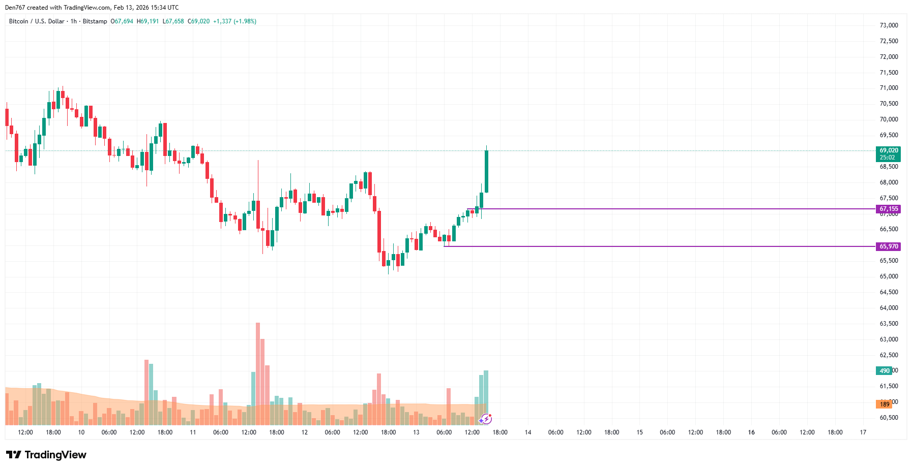 En el gráfico horario, la tasa de BTC está subiendo después de una ruptura de la resistencia local en $67,155. Si la barra diaria cierra lejos de esa marca, el movimiento ascendente puede continuar hacia la zona de $70,000.