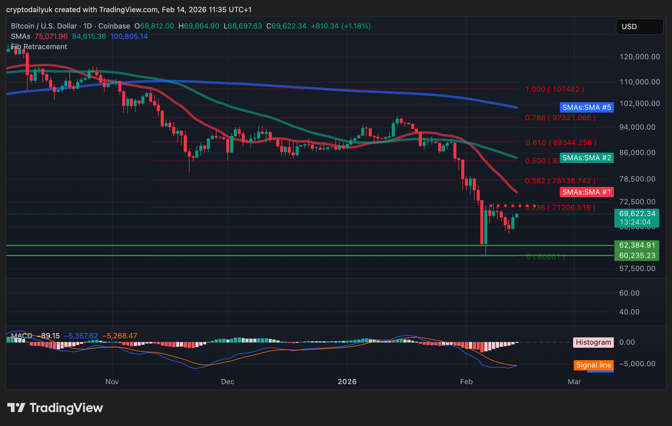El MACD muestra que el impulso del mercado está a punto de cambiar de bajista a alcista. El precio debe superar la resistencia en el nivel de retroceso de Fibonacci de 0.236 ($71,200) para validar esta reversión alcista. Si se supera esta resistencia, el precio de BTC debería ganar el impulso para cruzar la SMA de 50 días a $75,000. Sin embargo, en la baja, si los bajistas toman el control, el objetivo a la baja está muy por debajo en $60K.