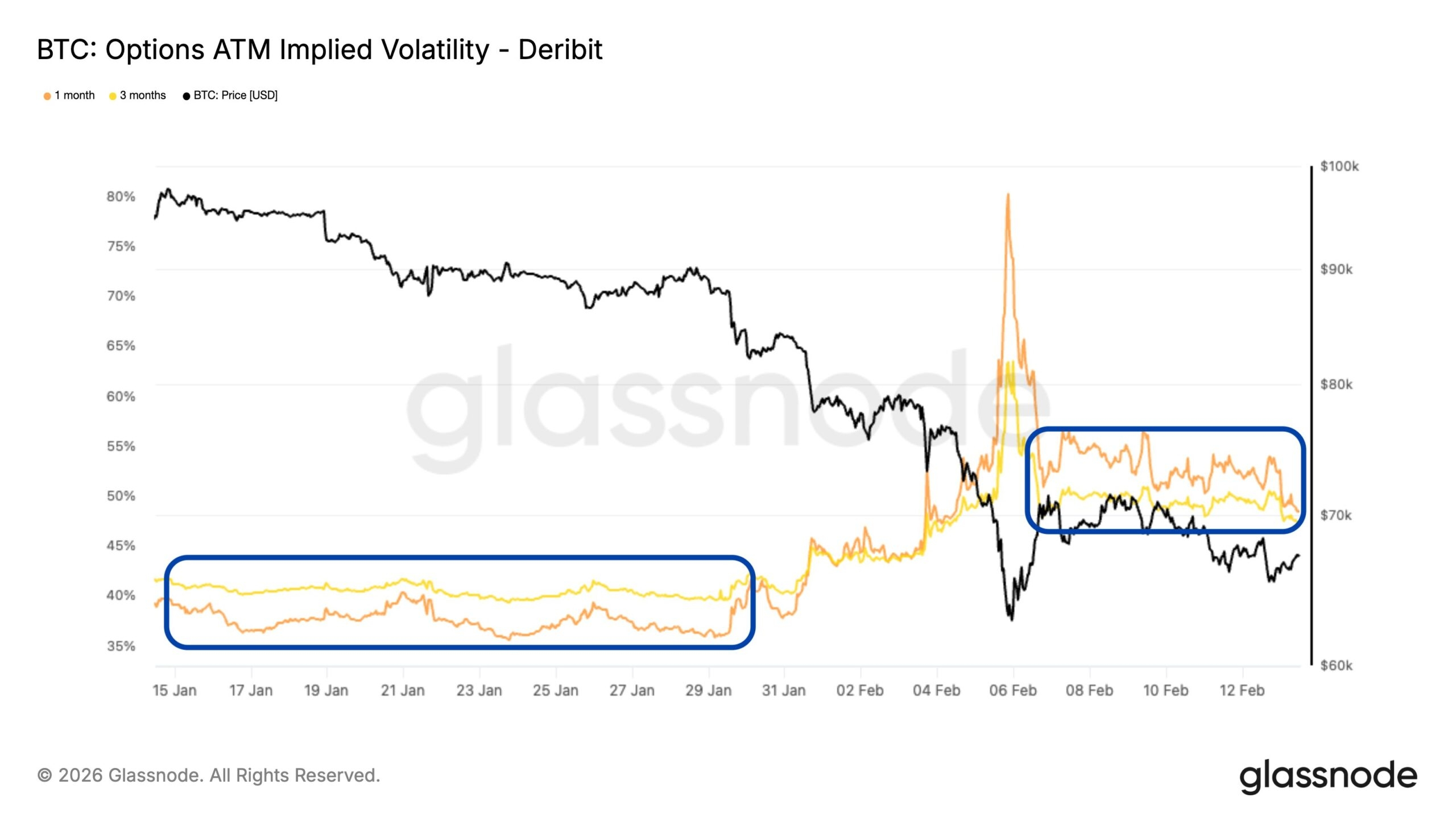 A medida que el Interés Abierto se reconstruye, la volatilidad se está revaluando al alza. La IV ATM a 1M y 3M ha aumentado aproximadamente 10 puntos de volatilidad en las últimas semanas. A pesar de la consolidación, los traders están valorando movimientos hacia adelante más grandes.