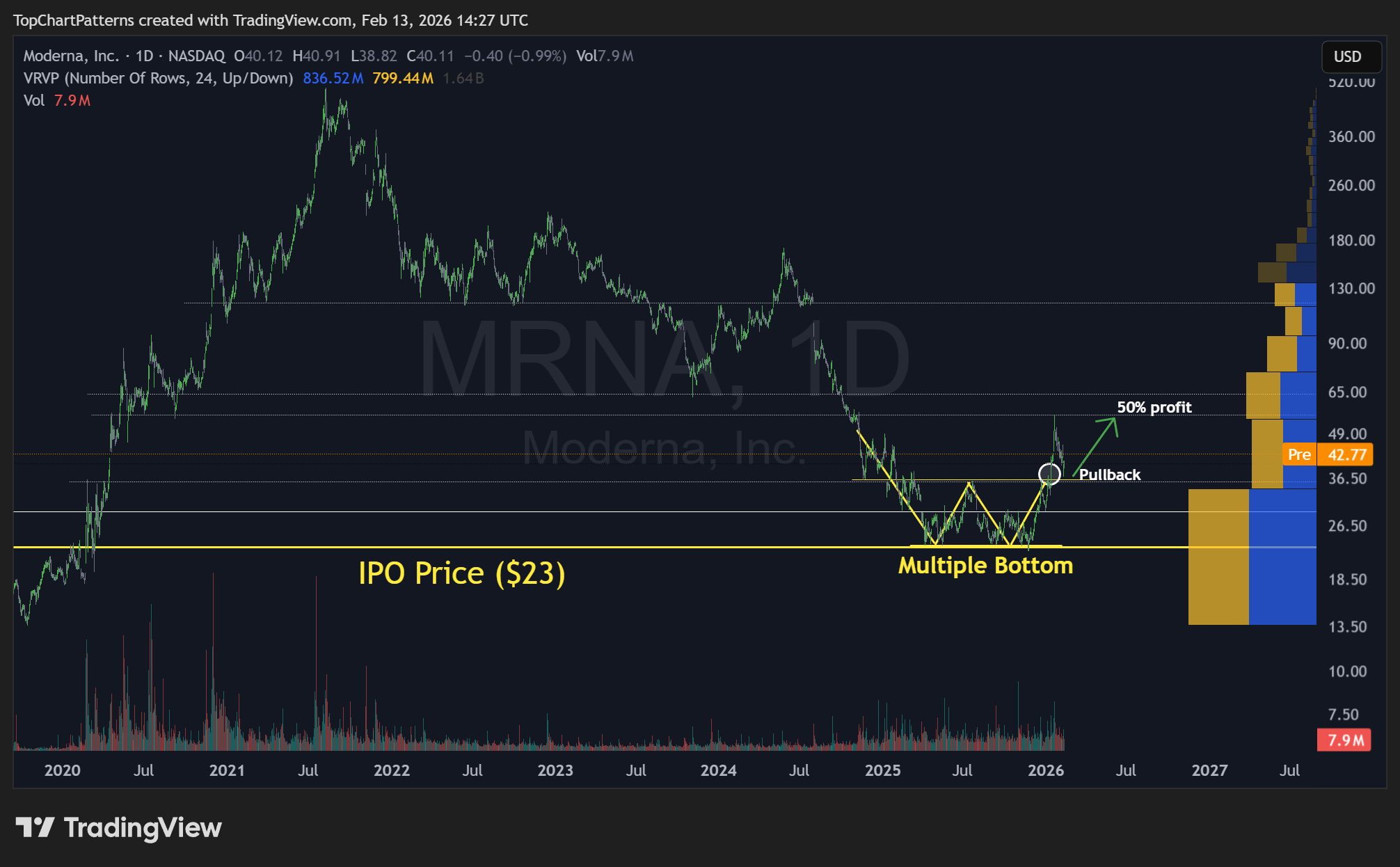 El mercado ha comenzado a valorar estos desarrollos. Vimos un rally del 150% en 3 meses antes de la corrección actual. Esto fue impulsado principalmente por los resultados de la Fase 3 del tratamiento contra el cáncer asociado con Merck. Estos resultados validan su tecnología de ARNm para aplicaciones no infecciosas y podrían revolucionar los tratamientos contra el cáncer. Su vacuna combinada contra la gripe y COVID también recibió aprobación.