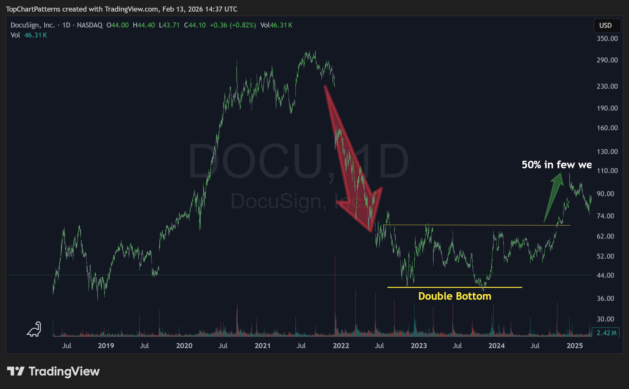 Esto creó una gran oportunidad de entrada en la corrección. Al colocar un Stop Loss ajustado justo dentro del Múltiple Fondo, podemos apuntar a un 50% de ganancia a corto plazo y ganancias mucho más grandes a mediano plazo.