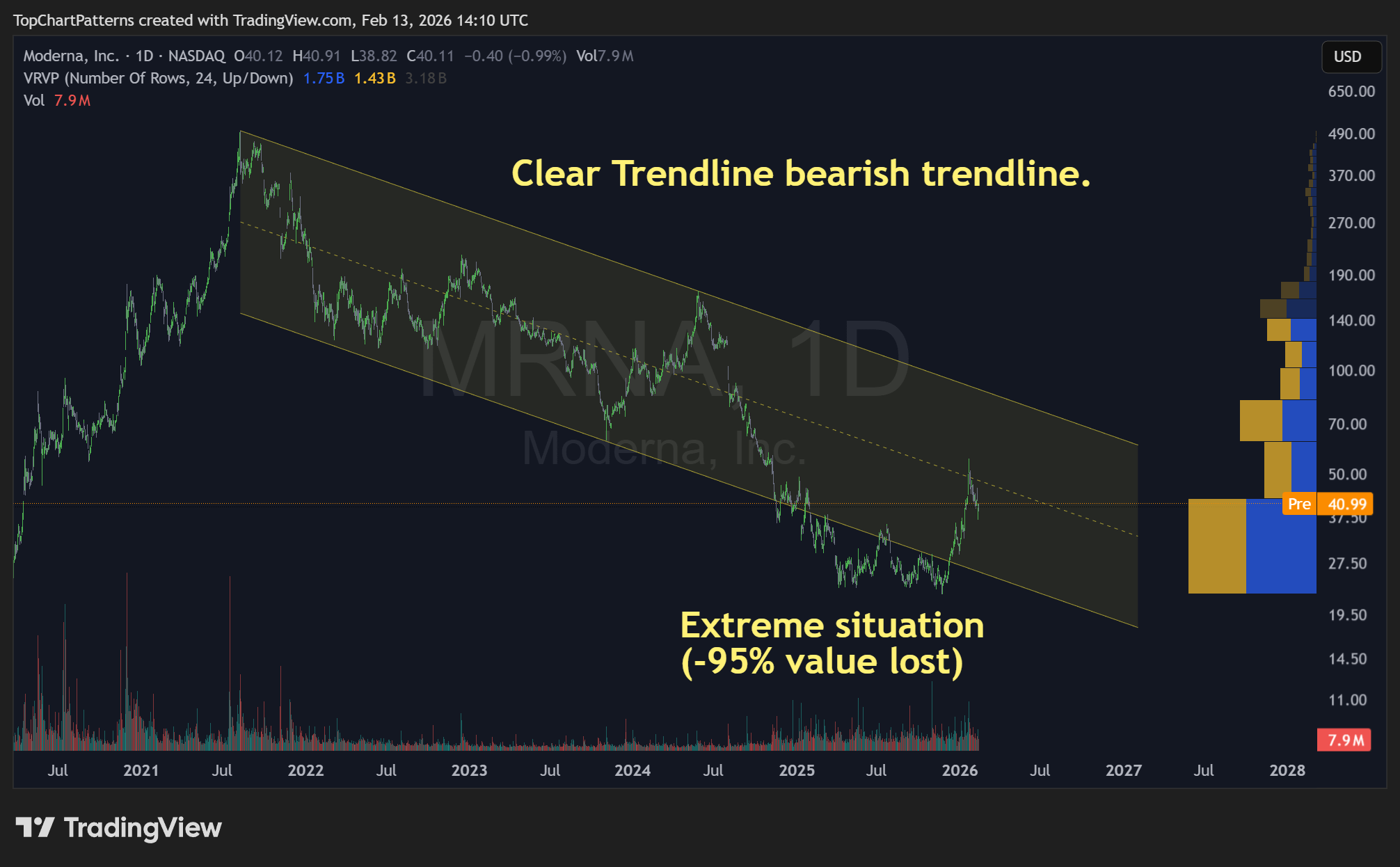 El gráfico habla por sí mismo. Desde mediados de 2021, Moderna ha caído constantemente, eliminando casi el 95% de su valor en el mercado de valores.