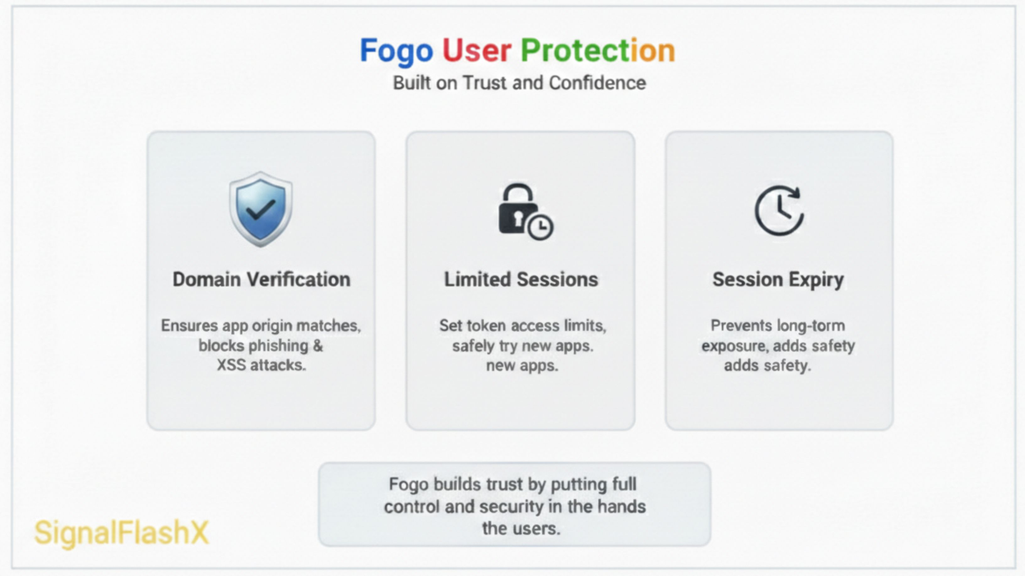 Fogo is built with a strong focus on user safety, creating an environment where trust and control come first. Its protection system is designed to reduce risk while keeping the user experience smooth and simple. One of its most powerful features is domain verification. The intent message includes a domain field that must exactly match the origin of the running application. This smart safeguard helps prevent phishing attempts and XSS attacks, ensuring users never unknowingly sign a session for a malicious or fake app.