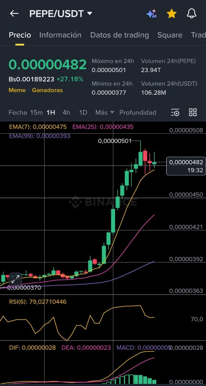 $PEPE 🐸 despertó y ha subido un 28% en las últimas 24 horas, rompiendo el letargo y tocando un techo de 0.00000501.. Pero ¿es momento de entrar o de salir corriendo?
