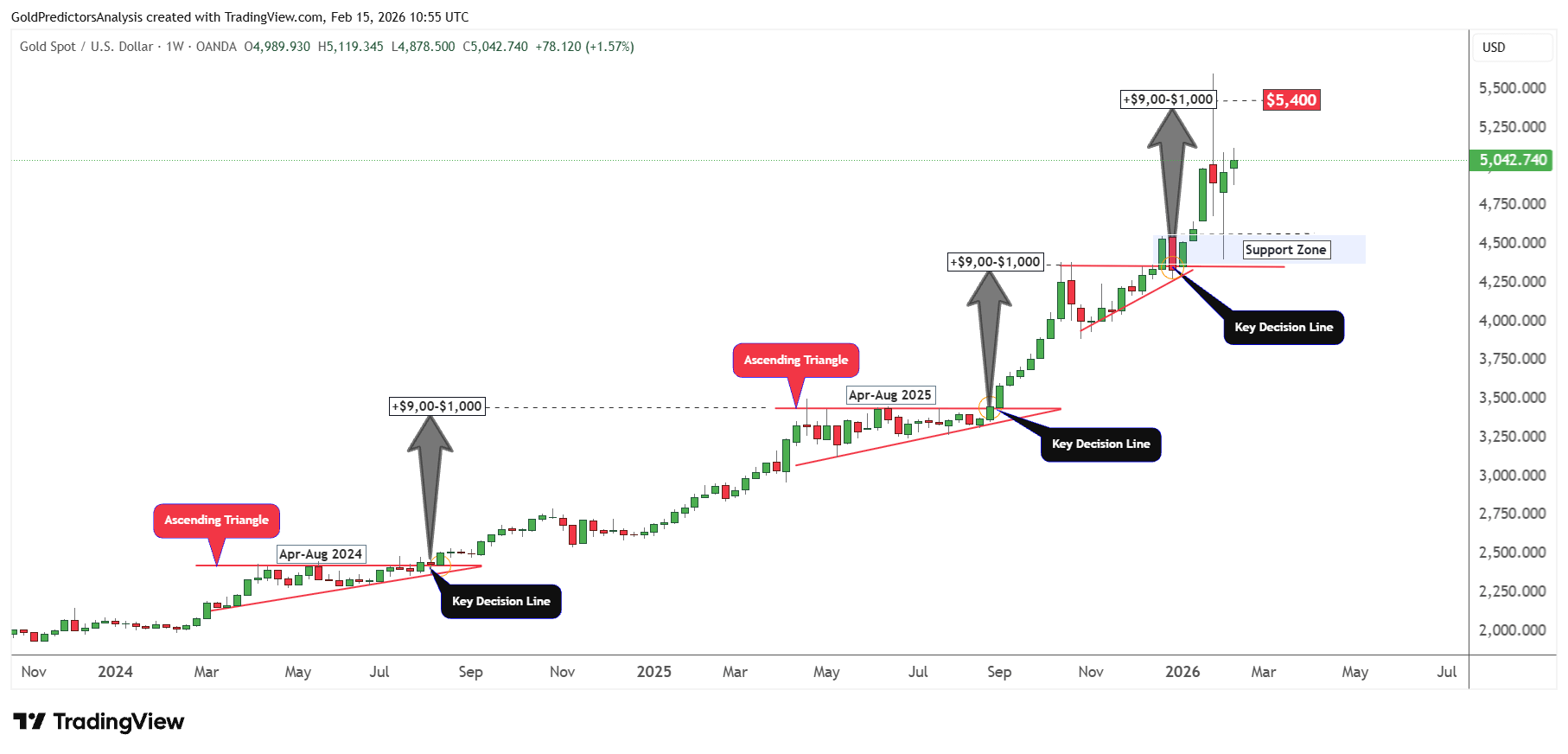 Desde una perspectiva técnica, la acción del precio del oro es una clase magistral en "consolidación alcista." Hemos visto una serie de patrones de triángulos ascendentes—primero en 2024, luego dos veces en 2025. Históricamente, estas formaciones han precedido enormes ráfagas de $900 a $1,000. 🚀