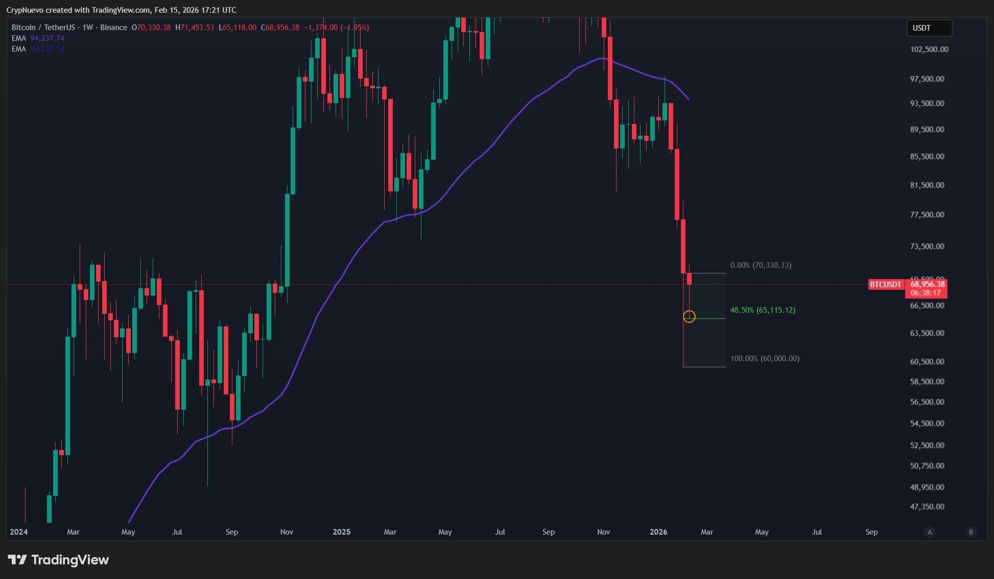 Actualmente a $68,343, el promedio móvil exponencial (EMA) de 200 semanas forma una de las dos líneas cercanas en la arena para los participantes del mercado. La otra es el antiguo máximo histórico de Bitcoin de 2021 en poco más de $69,000.