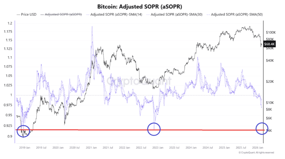 El 6 de febrero, la métrica cayó por debajo de su nivel de equilibrio de 1, lo que implica pérdidas realizadas en una escala no vista desde 2023 y el final del último mercado bajista de Bitcoin.