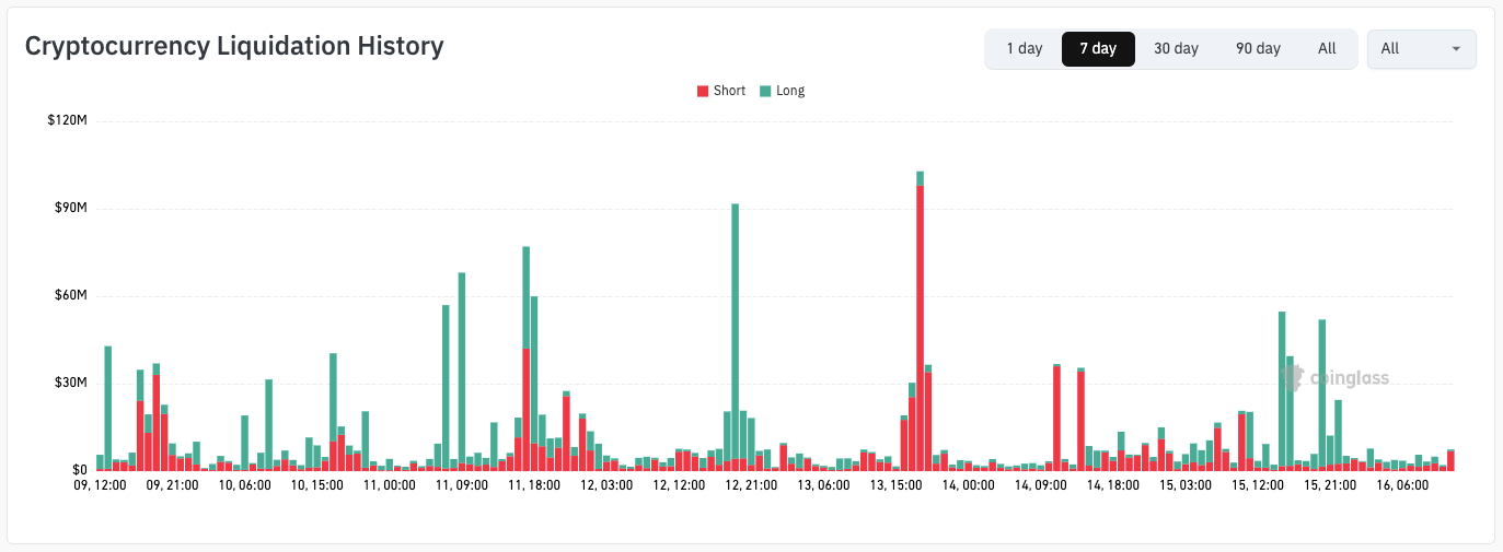 Esto se refleja en liquidaciones elevadas en el criptomundo, con posiciones largas y cortas cerca del precio de contado siendo borradas repetidamente.