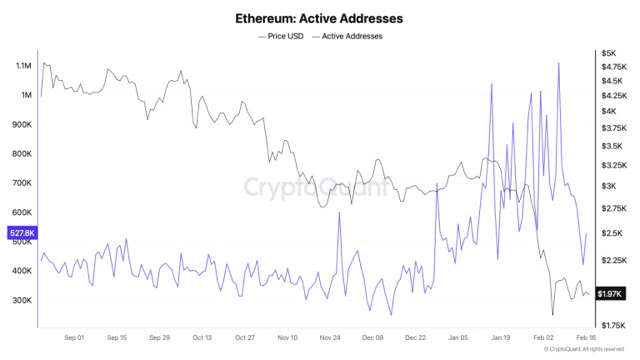 Ончейн-метрики тоже указывают на ослабление динамики. Число активных адресов Ethereum достигло локального пика в начале февраля, но начало снижаться после 7 февраля.