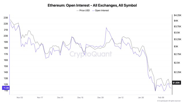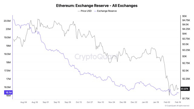 Сейчас ETH торгуется около $1 970 после пробоя на повышенных объёмах, который подтвердил формирование понижающегося максимума на недельном графике. Параллельно открытый интерес на биржах сократился почти на 50%, число активных адресов снижается с начала февраля, а резервы ETH на централизованных площадках начали расти после нескольких месяцев устойчивого оттока.