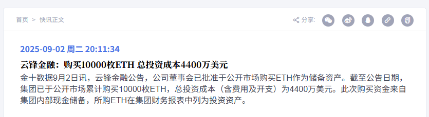 云锋下注以太坊,确实令人兴奋,周二公告云锋通过 HashKey 买入一万枚以太坊。