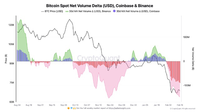 Аналитика CryptoQuant показывает, что с октября чистая дельта спотового объема остается устойчиво отрицательной. Это значит, что продажи доминируют над покупками.