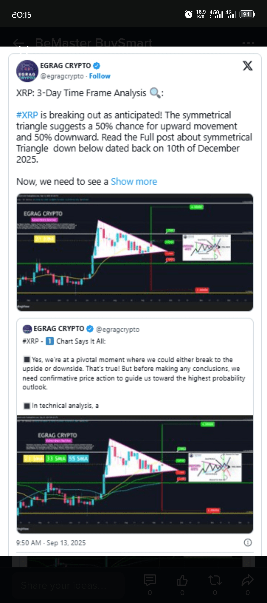 $XRP Egrag Crypto, un analista de mercado bien conocido, ha centrado su atención en una configuración decisiva que se está formando en el gráfico de tres días de XRP. En una publicación reciente en X, notó que el token está rompiendo un patrón de triángulo simétrico que señala una probabilidad de 50-50 de moverse hacia arriba o hacia abajo.