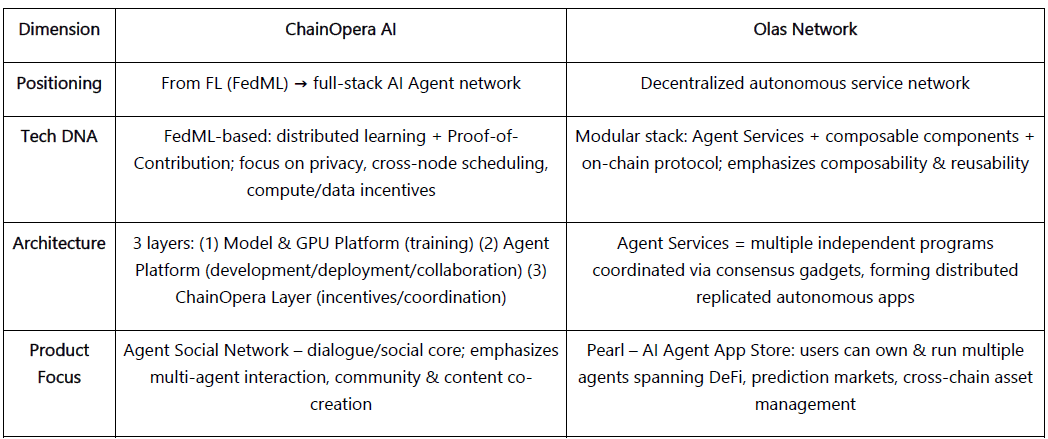 Capa de Red de Agentes: ChainOpera vs. Olas