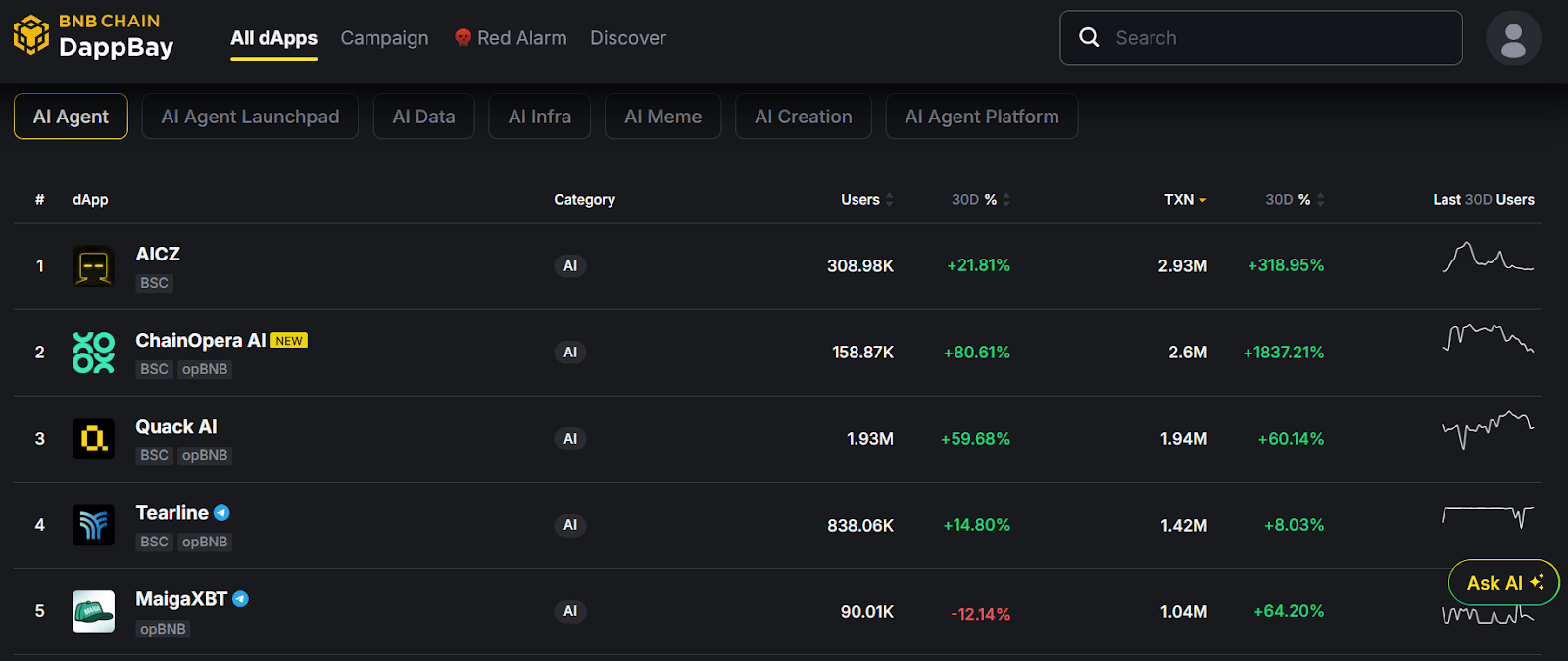 Según los datos en cadena de BNB DApp Bay (últimos 30 días): 158.87K usuarios únicos, 2.6M transacciones y clasificado #2 en toda la categoría de “Agente de IA” en BSC, lo que demuestra una fuerte y creciente actividad en cadena.