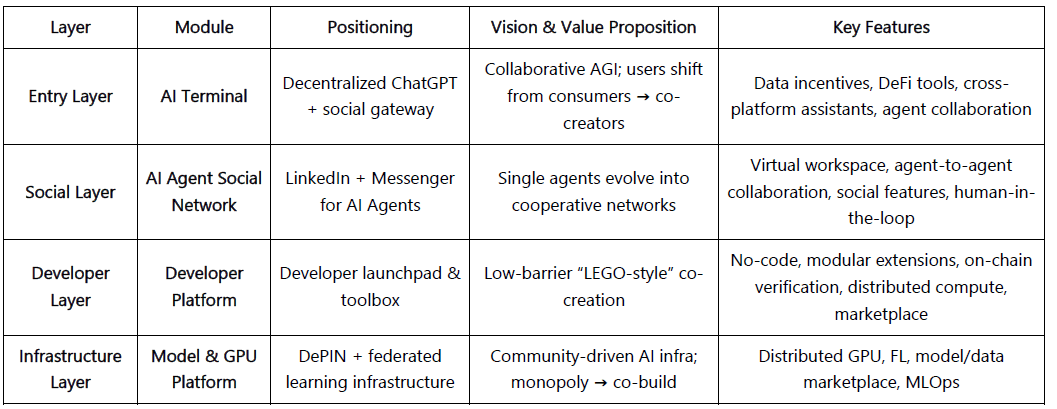 Capa de Plataforma: Se integra profundamente con la plataforma de modelos TensorOpera y FedML, habilitando servicios de modelo distribuidos, optimización de RAG y despliegue híbrido en la nube y en el borde.