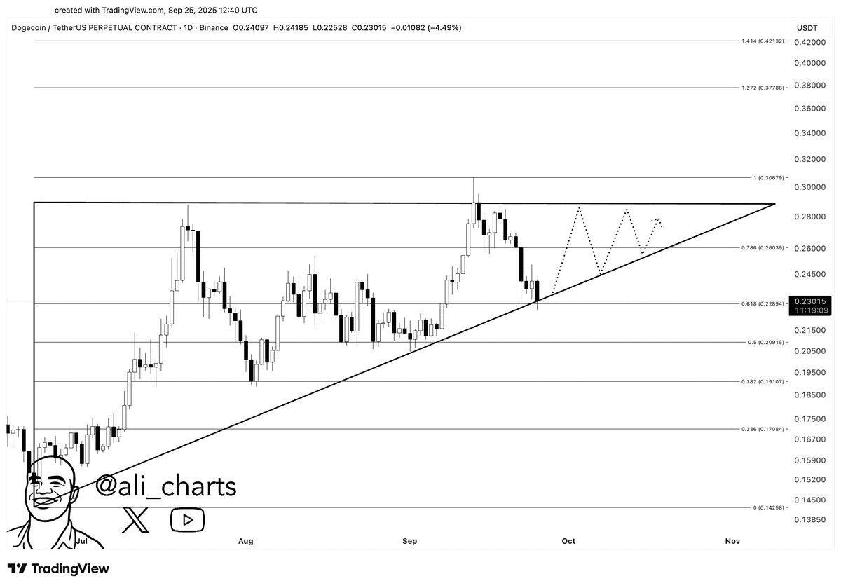 Según el gráfico diario del analista Ali, Dogecoin está comerciando alrededor de $0.23015, lo que es ligeramente superior al nivel de soporte crítico de $0.22. Este nivel está alrededor del retroceso de Fibonacci 0.618 en $0.228, que es un nivel importante para los toros. Además, podría ser posible que se mantenga este nivel para preservar el triángulo ascendente y permitir que el precio se consolide hacia la resistencia de $0.29.