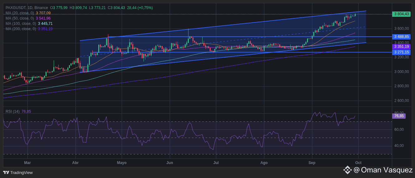 PAXG/USDT se encuentra actualmente probando el límite superior de su canal ascendente, lo que representa una resistencia significativa. El precio opera cómodamente por encima de sus principales Medias Móviles Simples (SMA), lo que respalda la estructura alcista.