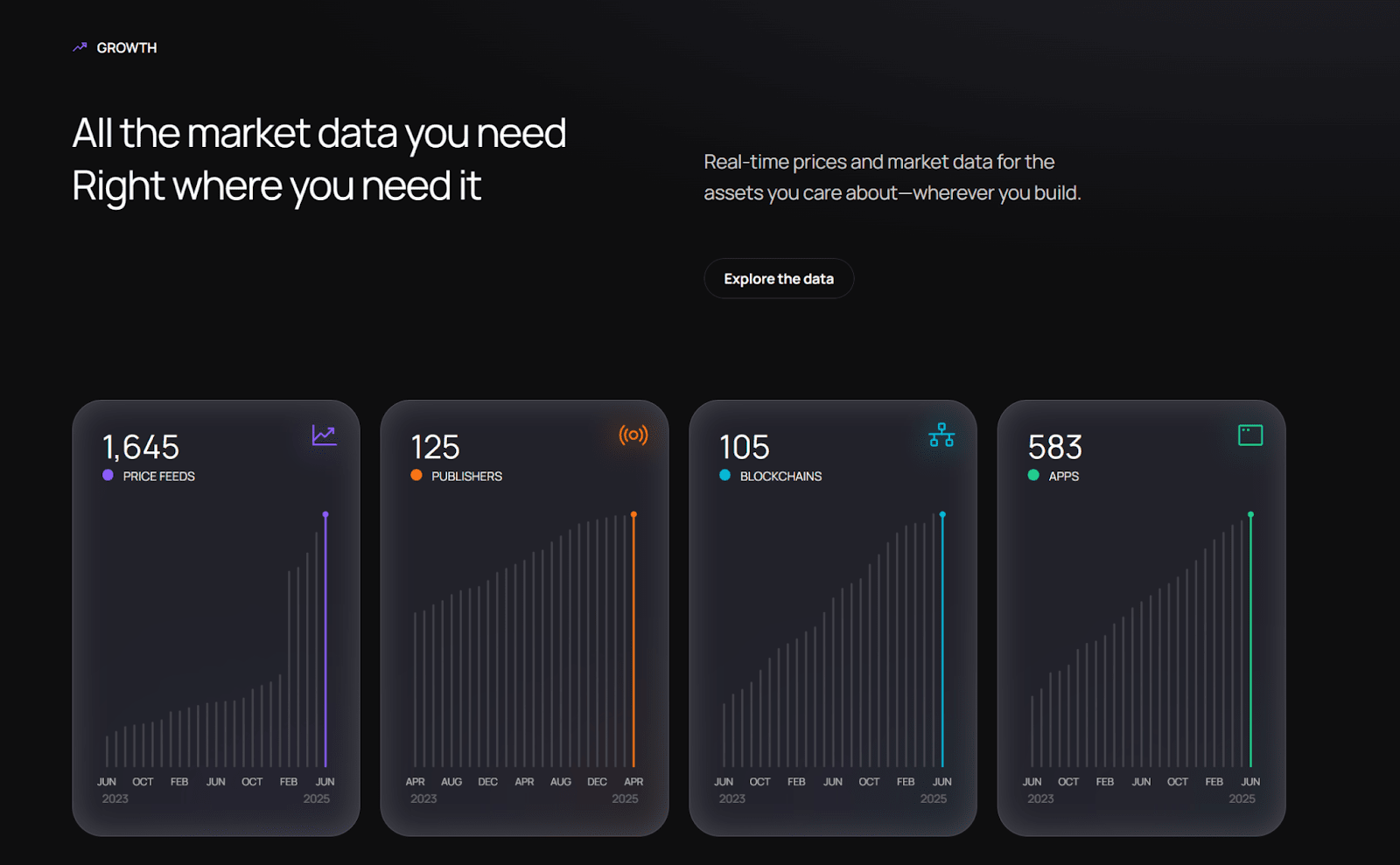 Pyth Network ha demostrado un rápido crecimiento y adopción, expandiéndose de Solana a 78 blockchains en solo unos pocos años. Su integración con más de 420 dApps y protocolos, combinada con más de 115 proveedores de datos de primera parte, destaca tanto la validación técnica como institucional.