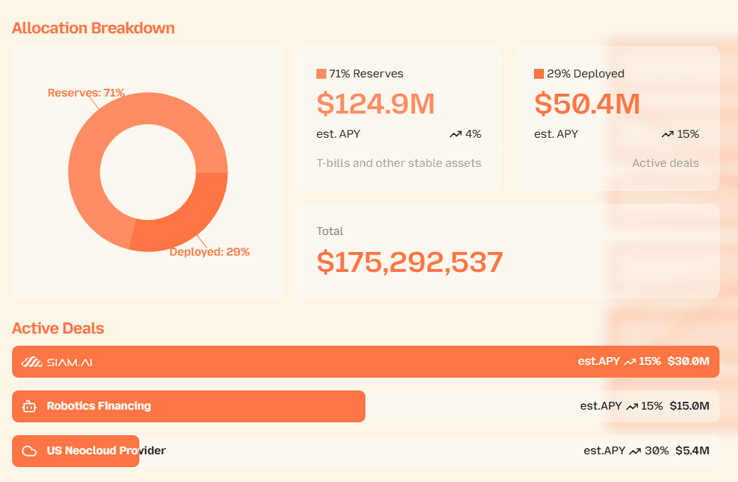 Los activos desplegados (Deployed) representan el 29%, aproximadamente $50.4M, utilizados para proyectos de financiamiento de GPU y robótica fuera de la cadena, con un rendimiento anual promedio de aproximadamente el 15%.