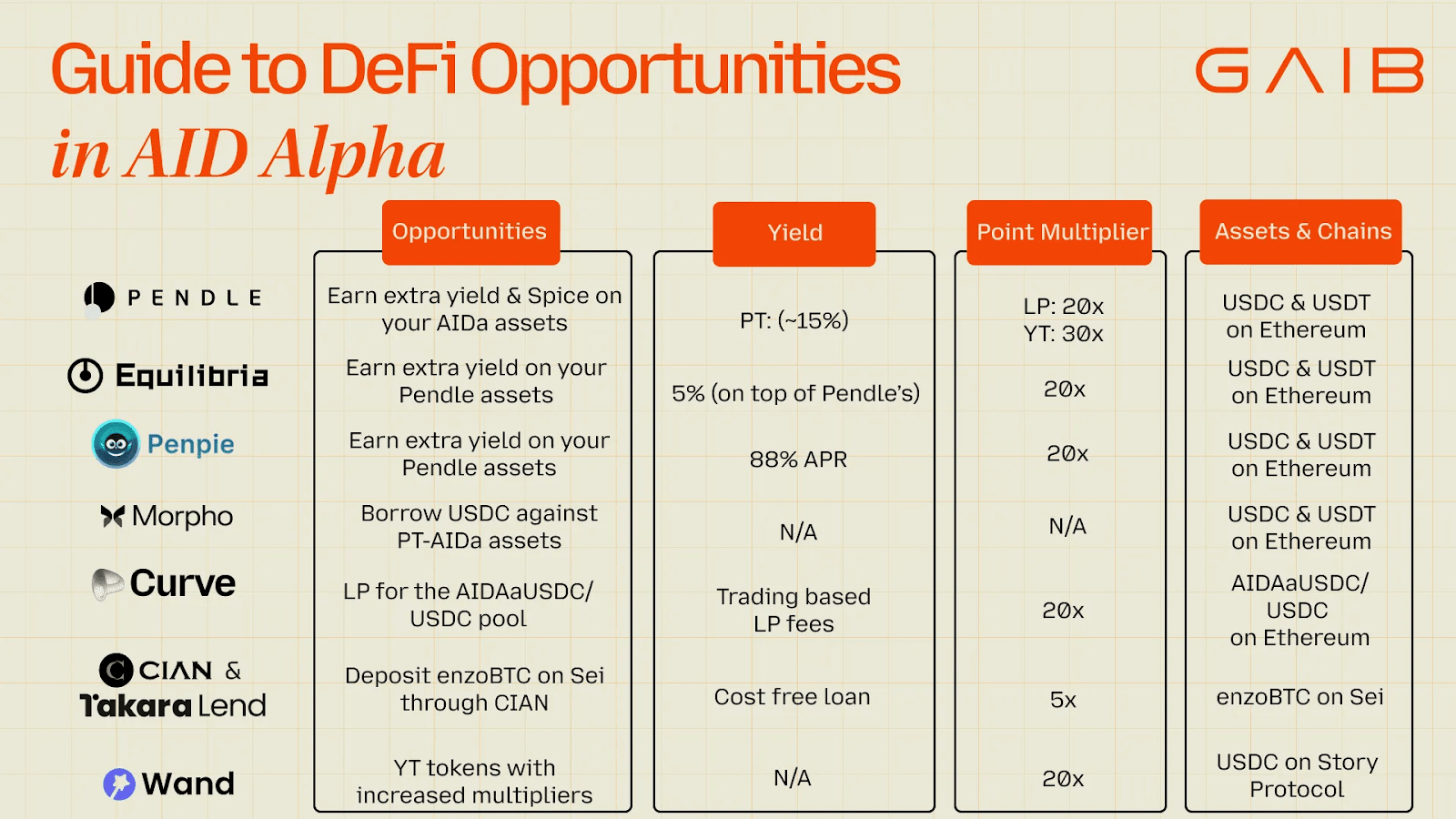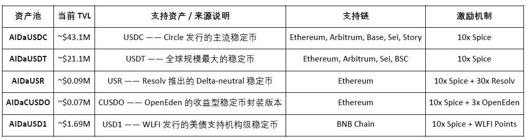 En la fase Final Spice, GAIB ha abierto múltiples entradas de monedas estables diversificadas a través del mecanismo AIDα, incluyendo USDC, USDT, USR, CUSDO y USD1. Después de que los usuarios depositen monedas estables, recibirán un token de recibo correspondiente a AIDα (como AIDaUSDC, AIDaUSD1), que representa un comprobante de depósito y se contabiliza automáticamente en el sistema de puntos Spice, permitiendo una participación adicional en los juegos de combinación DeFi como Pendle, Curve, etc.