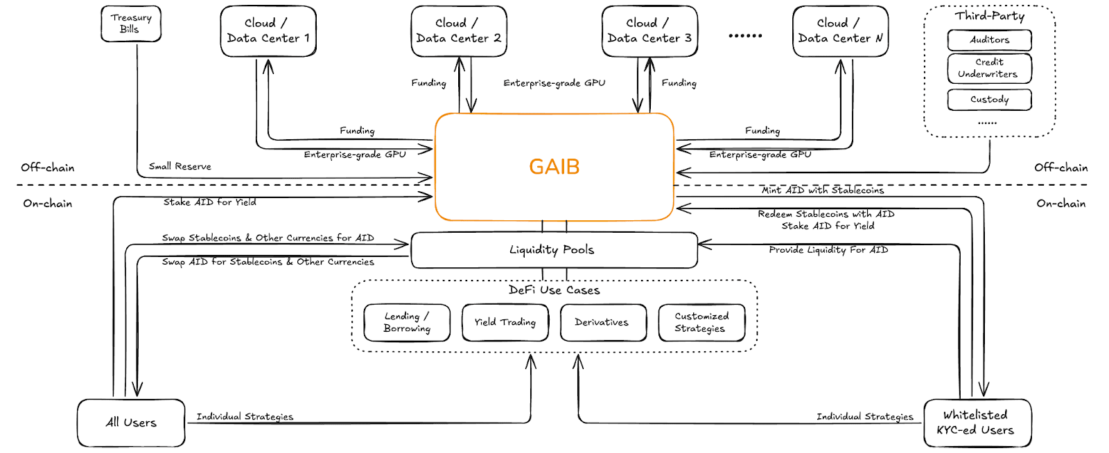 GAIB nace en este contexto, no tokenizando directamente el hardware de IA, sino llevando contratos de financiamiento colateralizados por GPU o robótica a la cadena, construyendo un puente económico que conecta el flujo de efectivo fuera de la cadena con el mercado de capitales en la cadena. Fuera de la cadena, los grupos de GPUs o activos robóticos utilizados por proveedores de servicios en la nube y centros de datos sirven como colateral; en la cadena, AID se utiliza para la gestión de valoración y liquidez (no generadora de intereses, reservas completas de T-Bills); sAID se utiliza para la exposición a ingresos y acumulación automática (con base en una combinación de financiamiento + T-Bills).