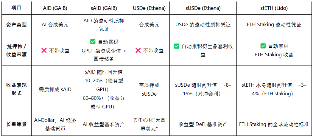 GAIB AID / sAID vs Ethena USDe / sUSDe vs Lido stETH comparación de modelos de rendimiento.