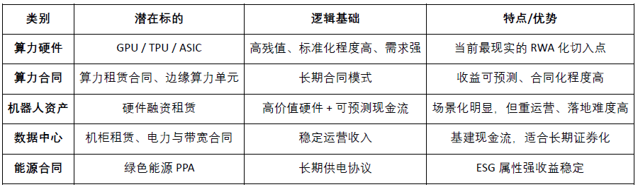 En los activos de capacidad de IA, hardware como GPU, debido a su valor residual claro, alto grado de estandarización y fuerte demanda, se considera universalmente como el principal punto de entrada para la RWA. Alrededor de la capa de capacidad, también se puede extender a contratos de arrendamiento de capacidad (Compute Lease), cuyo modelo de flujo de efectivo es contractual y predecible, adecuado para la securitización.