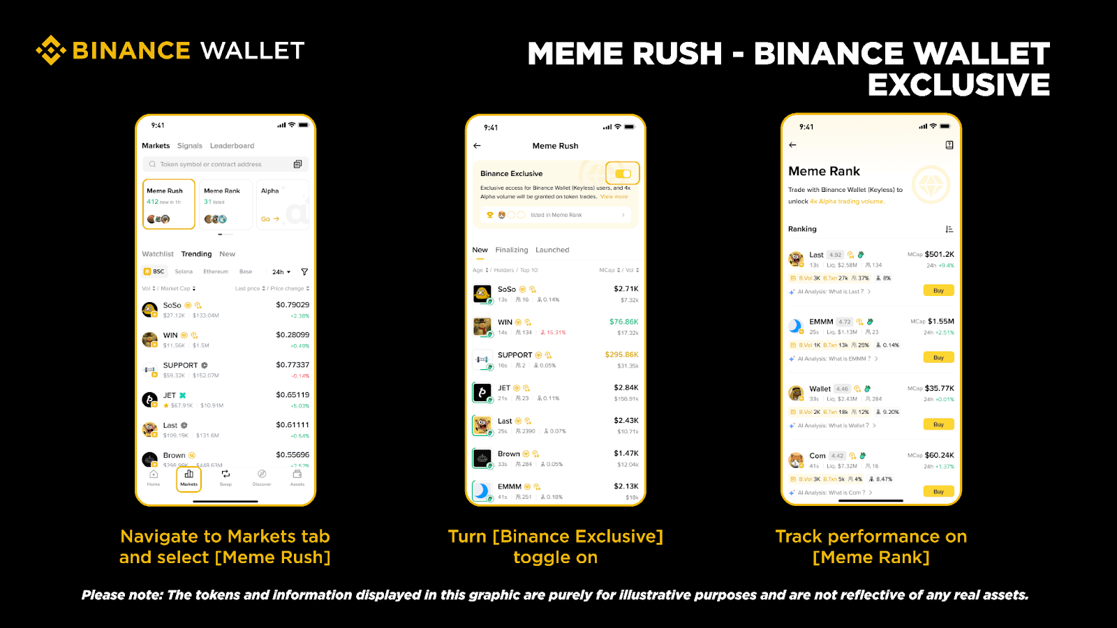 Meme Rush es el programa de lanzamiento de meme token diseñado específicamente para los usuarios de Binance Wallet - la función de billetera integrada en el ecosistema Binance que permite a los usuarios iniciar sesión y gestionar sus activos sin necesidad de una frase de recuperación (sin clave).