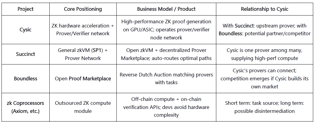 Dinámicas competitivas: los enfrentamientos a largo plazo en el nivel de acceso al cliente con Succinct/Boundless (mercados) o zk Coprocesadores maduros podrían empujar a Cysic a un papel de "fabricante de contrato" en upstream.