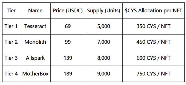 El suministro total de NFT es de 29,000 unidades, con aproximadamente 16.45 millones de CYS distribuidos (1.65% del suministro total, dentro del límite de asignación comunitaria del 9%).