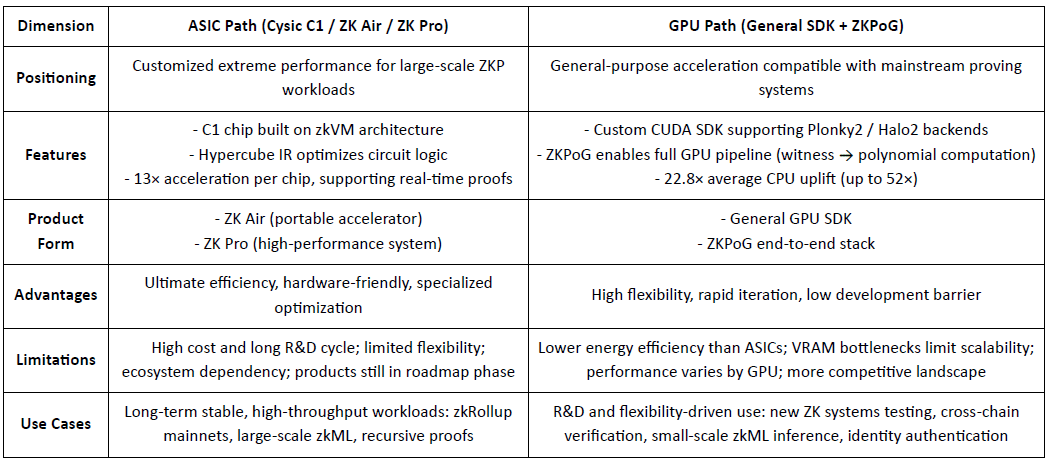 Cysic adopta una estrategia de doble vía: combinando innovación ASIC con aceleración de GPU, llevando ZK de "verificable" a "utilizable en tiempo real" a través de un enfoque de pila completa desde chips personalizados hasta SDK generales.