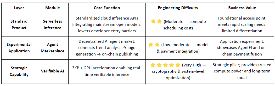 El marco empresarial de Cysic AI sigue una estructura de tres niveles: Producto, Aplicación y Estrategia: En la base, la Inferencia Sin Servidor ofrece API estandarizadas para bajar la barrera de acceso al modelo de AI; En el medio, el Mercado de Agentes explora aplicaciones en cadena de Agentes de AI y colaboración autónoma; En la parte superior, AI verificable integra ZKP + aceleración de GPU para permitir inferencias confiables, representando la visión a largo plazo de ComputeFi.