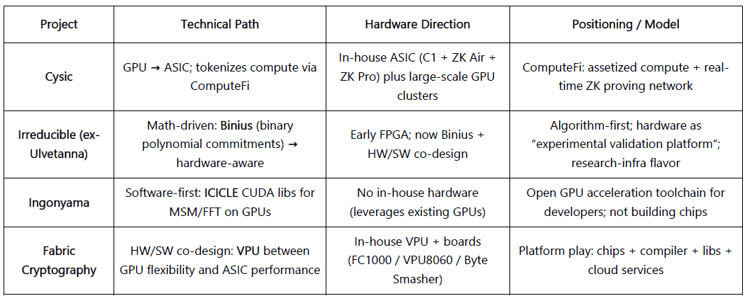En la pista de Prover acelerado por hardware y ComputeFi, los principales pares de Cysic incluyen Ingonyama, Irreducible (anteriormente Ulvetanna), Fabric Cryptography y Supernational, todos centrados en "hardware + redes que aceleran la prueba ZK."