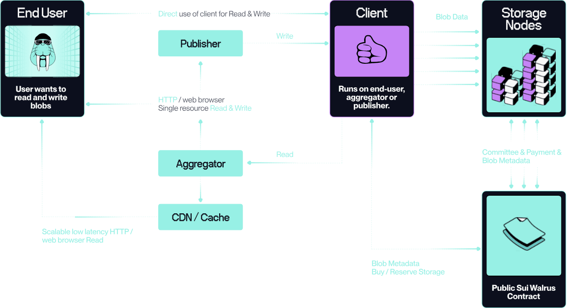 Nodo de almacenamiento: almacena datos, requiere staking de tokens WAL para operar.