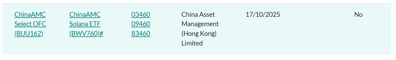 La Comisión de Valores y Futuros de Hong Kong (#SFC ) aprobó el Solana-ETF al contado de la empresa ChinaAMC. El producto comenzará a cotizar en la Bolsa de Valores de Hong Kong el 27 de octubre de 2025.