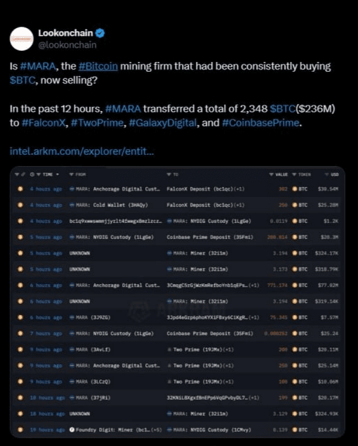 MARA en total ha transferido 2 348 BTC ($236 millones) FalconX, TwoPrime, GalaxyDigital y Coinbase Prime.