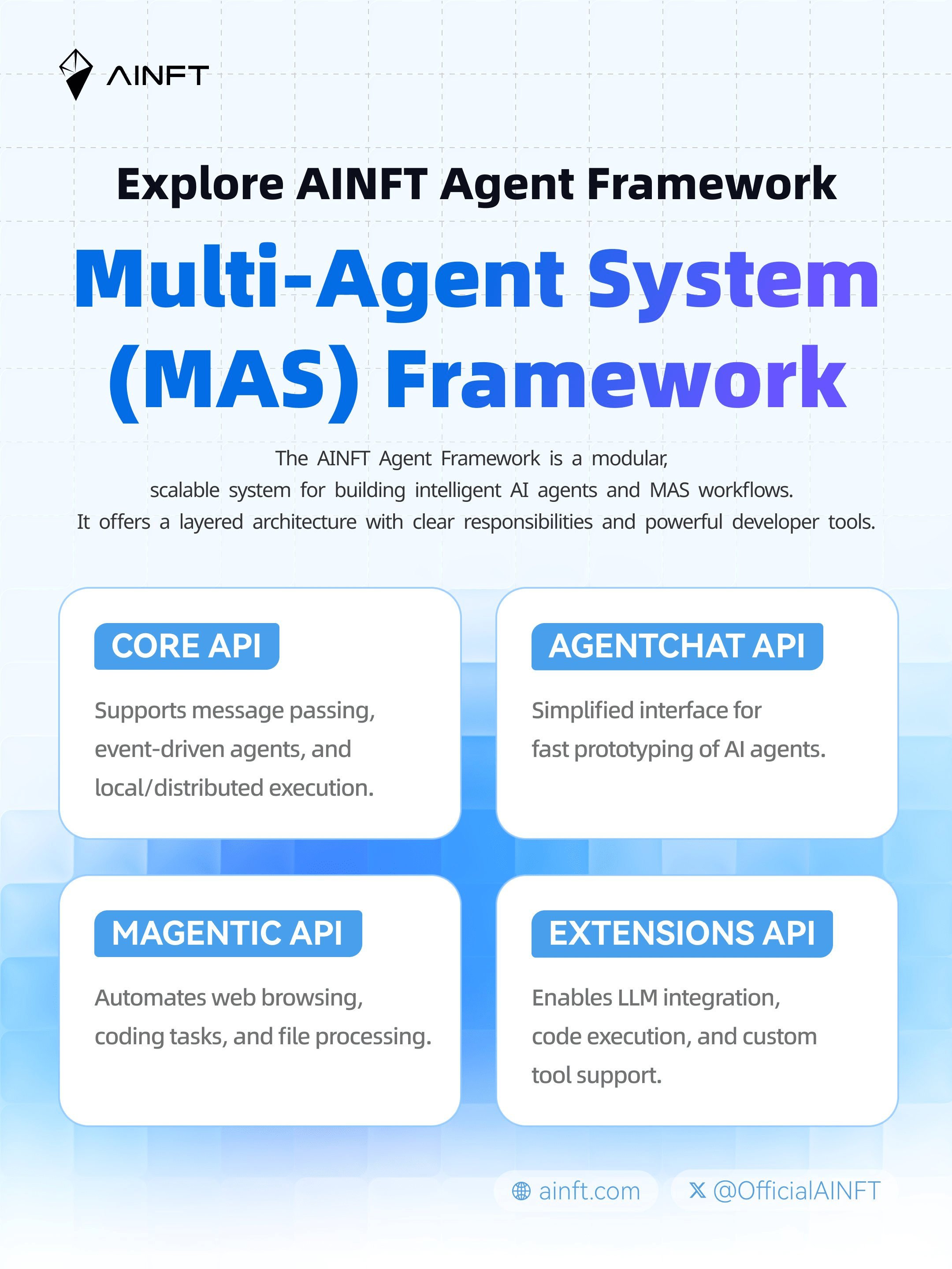 El AINFT Agent Framework ofrece una arquitectura modular y amigable para desarrolladores con cuatro API principales: