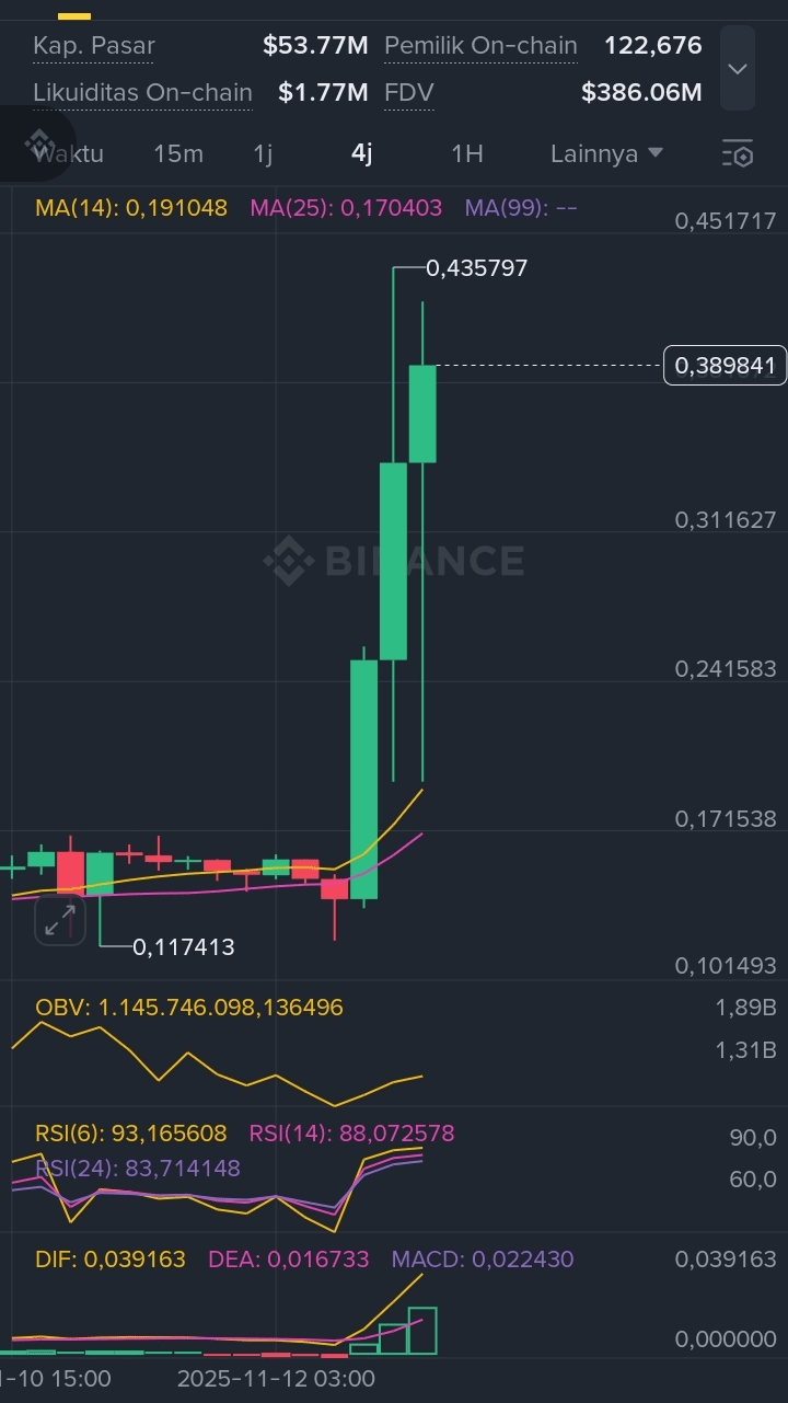 - Rango de Precio: Mínimo histórico de $0.1015 (principio de noviembre), máximo de $0.4517 (hoy). La tendencia general es alcista, pero sobrecomprada (RSI >80).