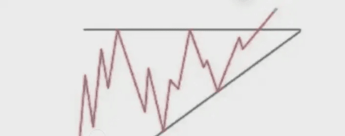 En un triángulo ascendente, las acciones están sobrecompradas, y el precio retrocede. Luego, los compradores ingresan nuevamente al mercado y el precio rápidamente alcanza un nuevo máximo histórico, después de alcanzar el máximo, vuelve a caer. Luego, los compradores volverán a aparecer, aunque el precio será más alto que antes. El precio finalmente rompe el punto anterior, y con la llegada de nuevos compradores, el precio será empujado aún más alto. En el caso del triángulo simétrico, la ruptura generalmente se acompaña de un aumento notable en el volumen de transacciones.