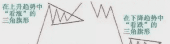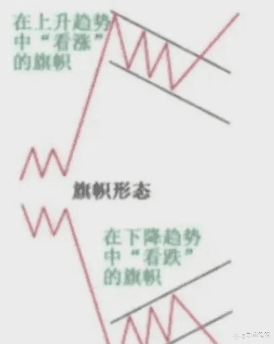 2. Las señales bajistas se componen de máximos más altos y mínimos más altos. La "bandera del mercado bajista" también tiene una inclinación de tendencia opuesta. Sus líneas de tendencia también son paralelas. El triángulo de bandera se parece mucho a un triángulo simétrico, pero el patrón de triángulo de bandera generalmente tiene menor volatilidad y duración, el volumen generalmente se contrae durante el estancamiento y se expande al romper.